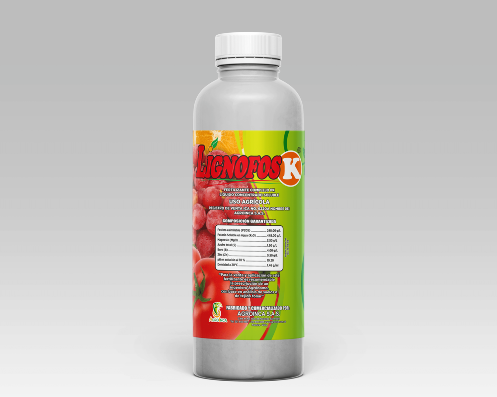 LIGNOFOS K es un fertilizante líquido de alta concentración con fósforo y potasio, formulado para potenciar floración, cuajado y llenado de frutos. Su base en lignosulfonatos de caña asegura mejor asimilación de nutrientes, brindando una solución moderna, eficiente y sostenible.